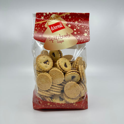 Hug Spitzbueben are classic Swiss jam-filled cookies that combine buttery, delicate shortbread with a fruity center. Known for their charming cut-out shape, these cookies bring a bit of Swiss tradition to any occasion. Hug Spitzbueben offer a deliciously sweet taste of Switzerland.
